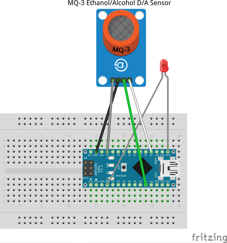 - MQ-3 - Alcohol/Ethanol. As mentioned in the datashseet to properlky calibrate these sensors you would need to be able to properly isolate the sensor in an area with an exact level of the gas you wish to sense for.So for alcohol have th sensor isolated in 0.4mg/l to gain a baseline. Fo rthis experiment the calibration was more ad-hoc.